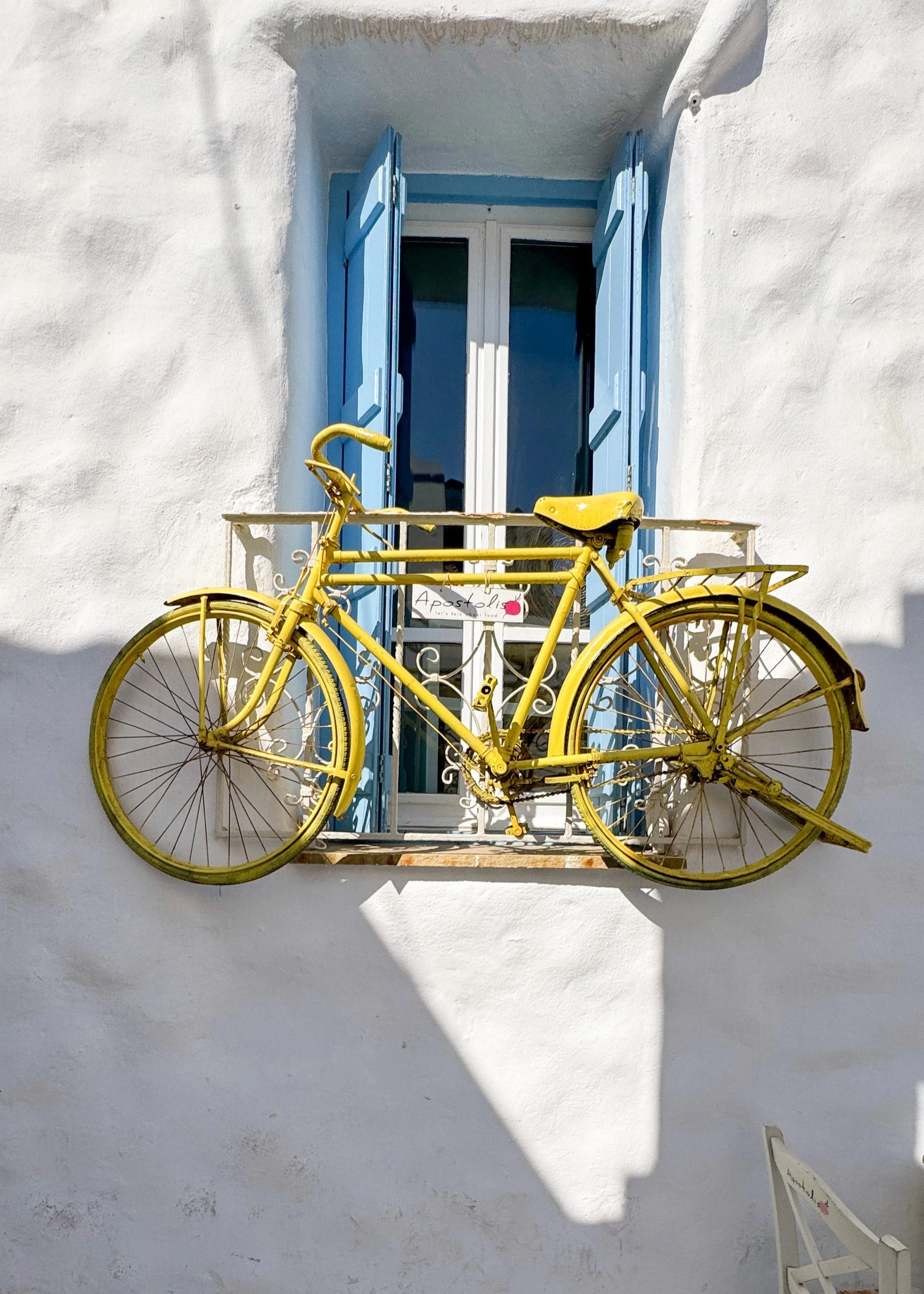 First for the colourful lampshades hanging over the taverna. Then for the yellow bike perched on the balcony out front. It’s pretty as and always ends up in photos. After that, it’s all about the food.
